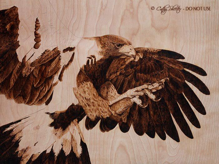 | "Landing Gear Engaged" - Harris Hawk Pyrography (wood burning) on birch plywood |